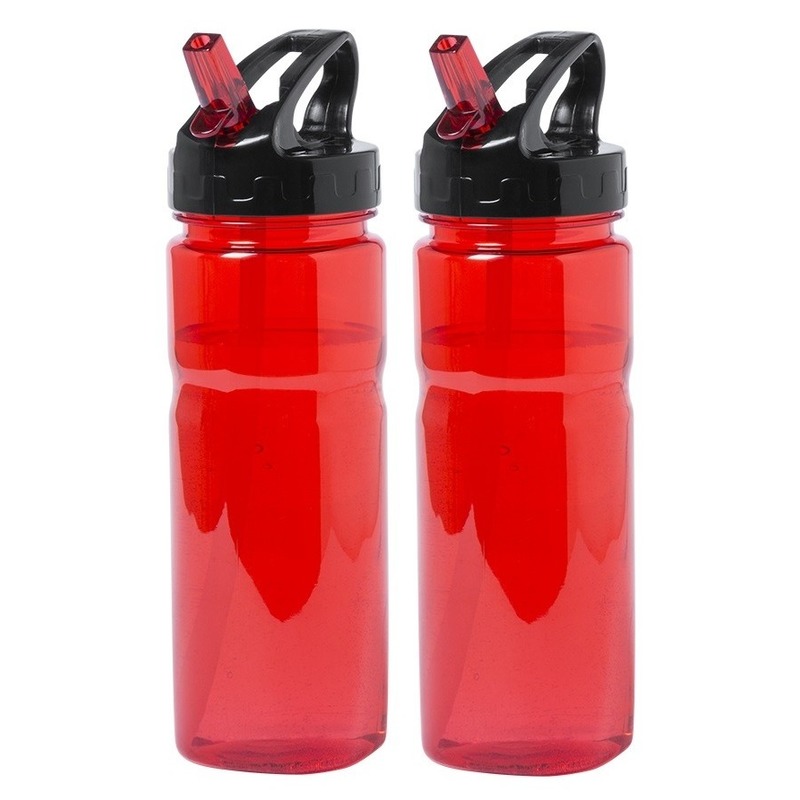 2x Rode drinkfles/waterfles met schroefdop. Gemaakt van tritan kunststof (BPA vrij) en hittebestending tot 70 graden. Inhoud: 650 ml. Formaat: 23 x 7 cm. Materiaal: tritan kunststof, bovenrand roestvrijstaal. Drinkflessen/waterflessen voor onderweg. U ontvangt 2 flessen.