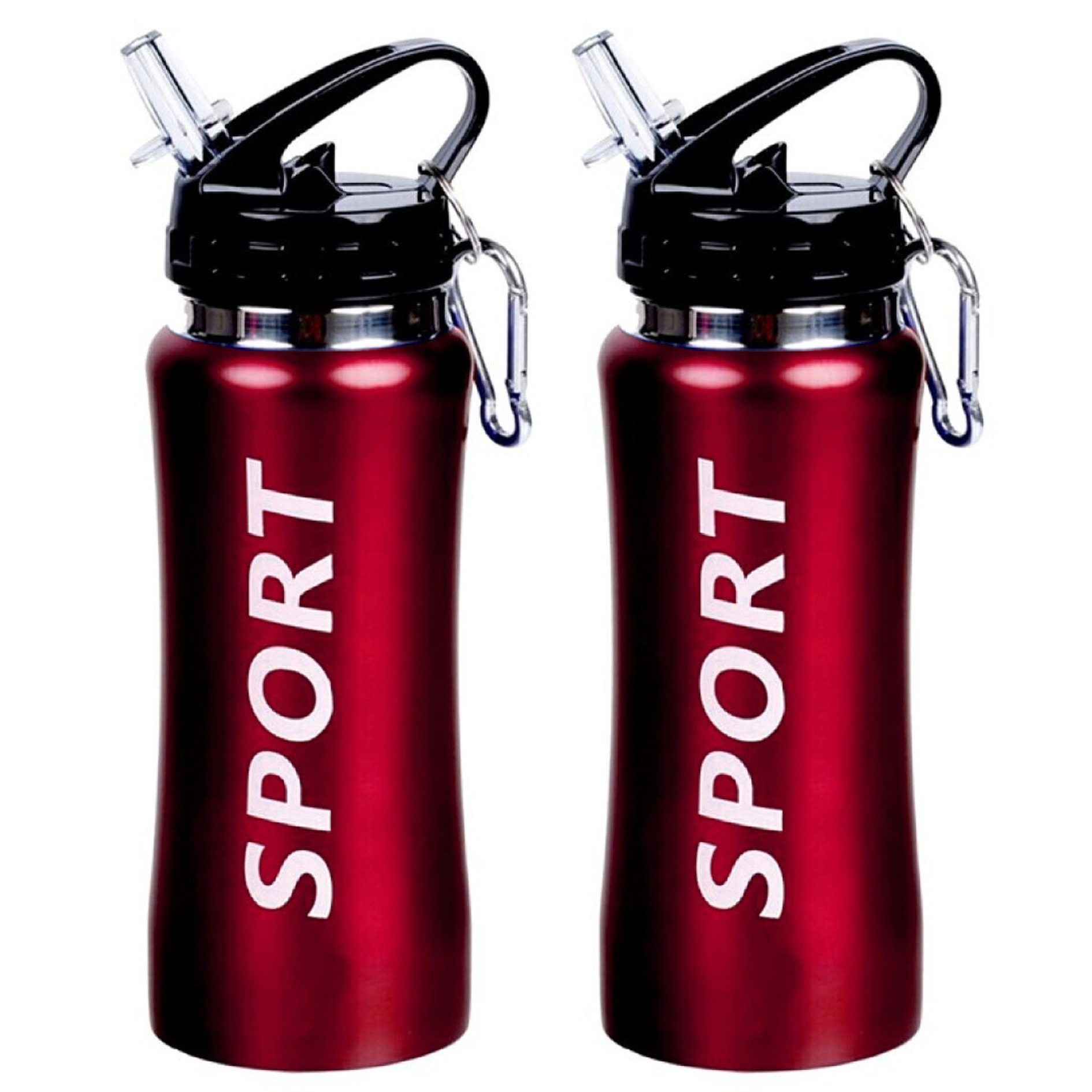 2x Sport Bidon drinkfles/waterfles Sport print rood 420 Ml. Waterfles met stevige sluiting, drinktuit en karabijnhaak. Materiaal: Aluminium. Formaat: 7 x 7 x 22 cm.