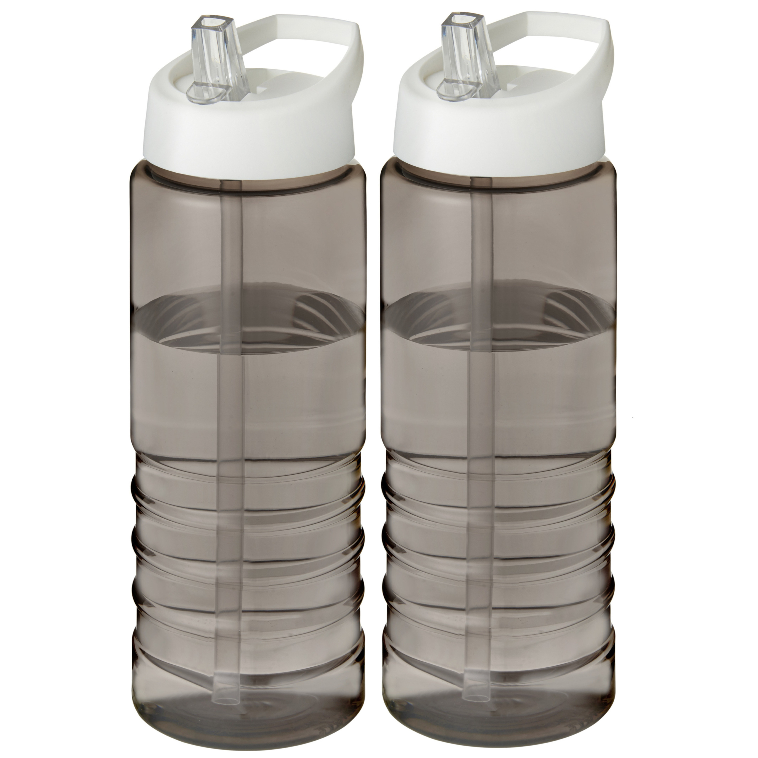 2x stuks sport bidon/drinkfles/waterfles gemaakt van gerecycled Hi-eco kunststof in de kleuren donkergrijs/wit met een inhoud van 750 ml. Met handige tuit-deksel. Enkelwandige drinkfles met geribbeld ontwerp gemaakt van Prevented Ocean Plastic. Het plastic wordt verzameld binnen een straal van 50 km van een oceaankustlijn of grote waterweg die uitmondt in de oceaan. Dit wordt vervolgens gesorteerd en omgezet in hoogwaardig en voedselveilig gerecycled plastic. Voorzien van een morsbestendig deksel met open te trekken drinktuit.