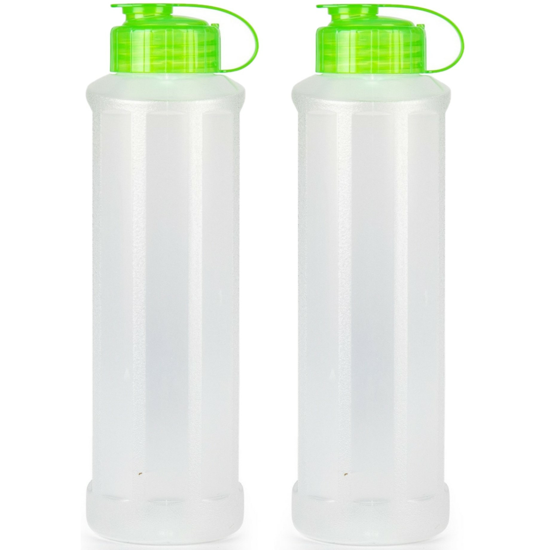 Drinkfles/bidon/waterfles 2x met een inhoud van 1600 ml, gemaakt van transparant kunststof met afsluitdop in het groen. Handige multifunctionele drinkfles voor sapjes en water. Voor recreatie en/of sport. Formaat: 30 x 9.5 cm. Kan in de vriezer en magnetron gebruikt worden.
