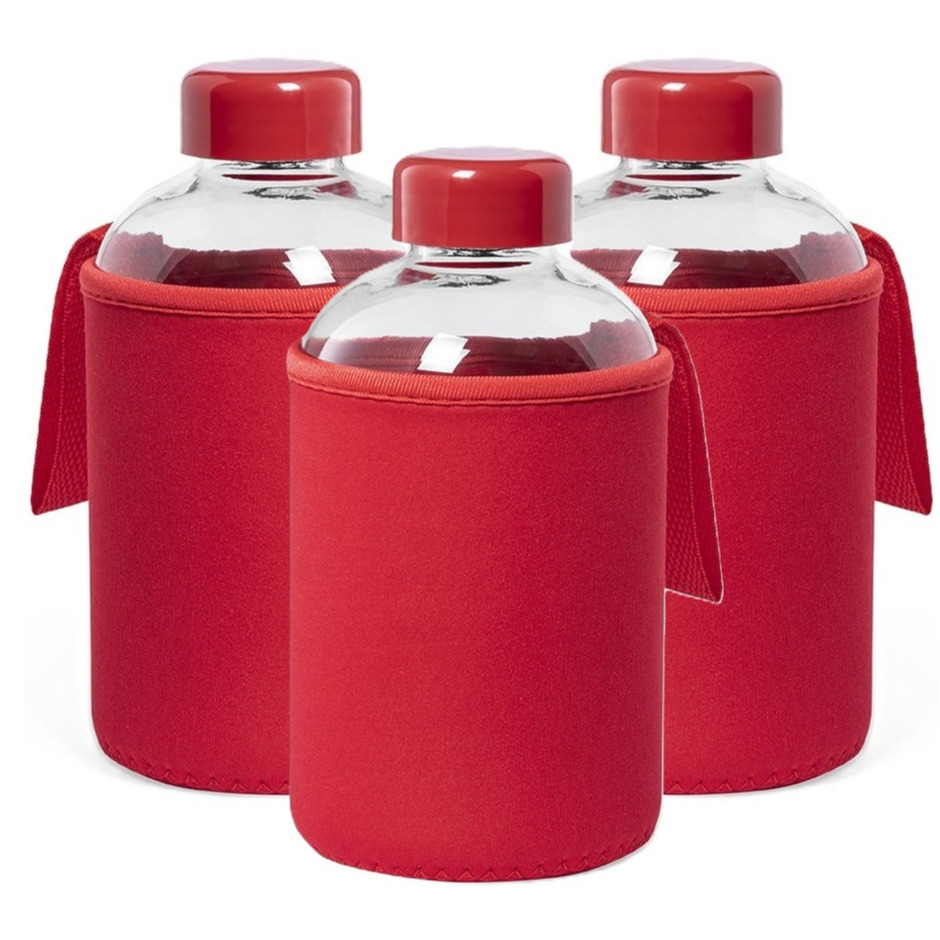 Glazen waterfles/drinkfles softshell bescherm hoes – 3x – rood – 600 ml – Sportfles – Bidon