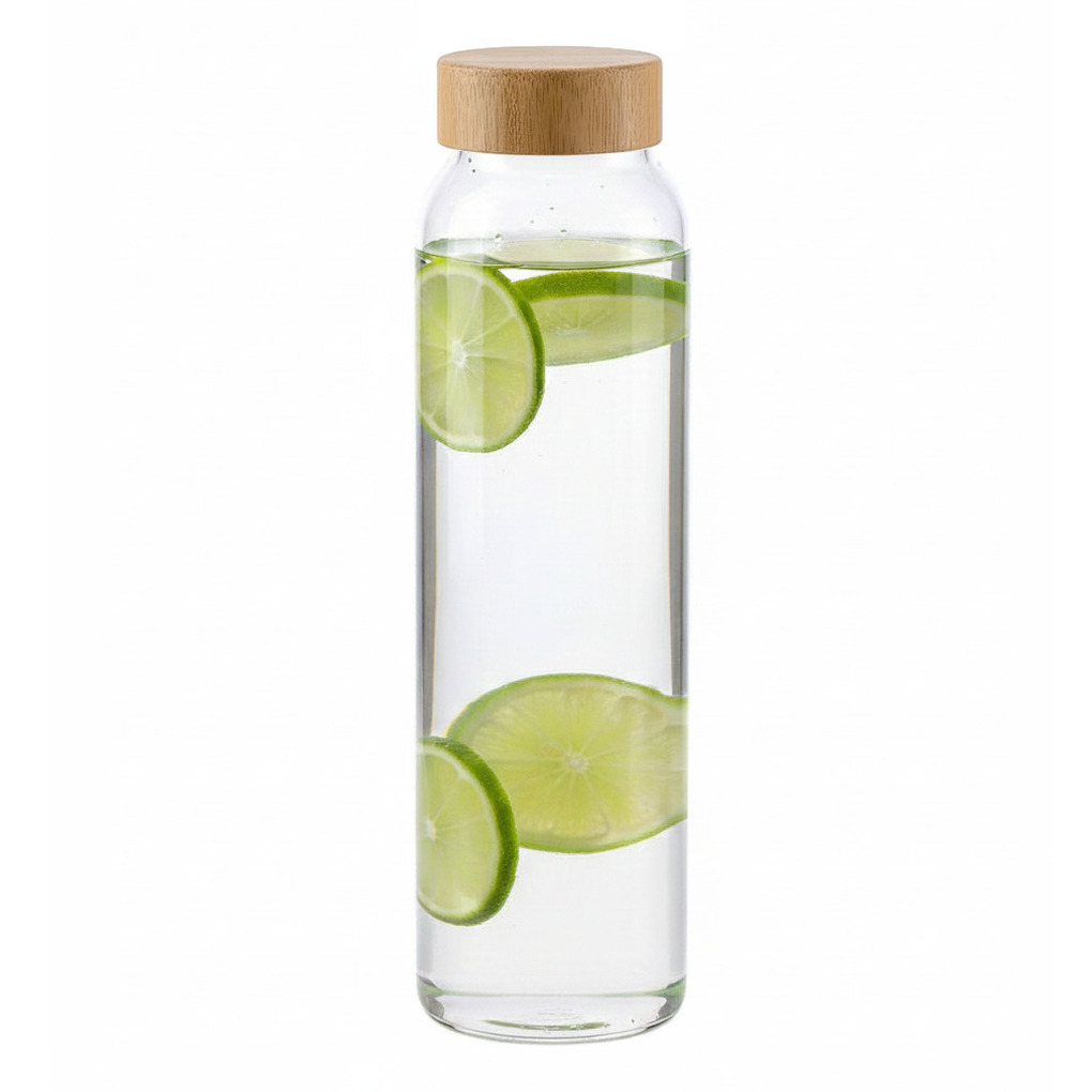 Glazen waterfles/drinkfles AQUACLEAR, in de kleur helder transparant voorzien van relief met Bamboe dop 1000 ml. Afmeting: ca. D7.5 x H28 cm. Inhoud: ca. 1000 ml, 100 cl. Gewicht: ca. 400 gram. Materiaal fles: verhard glas. Geschikt voor magnetron: nee. Geschikt voor vaatwasser: ja (max. 50 graden) de dop niet. Geschikt voor vriezer: ja. Sport bidon flessen.