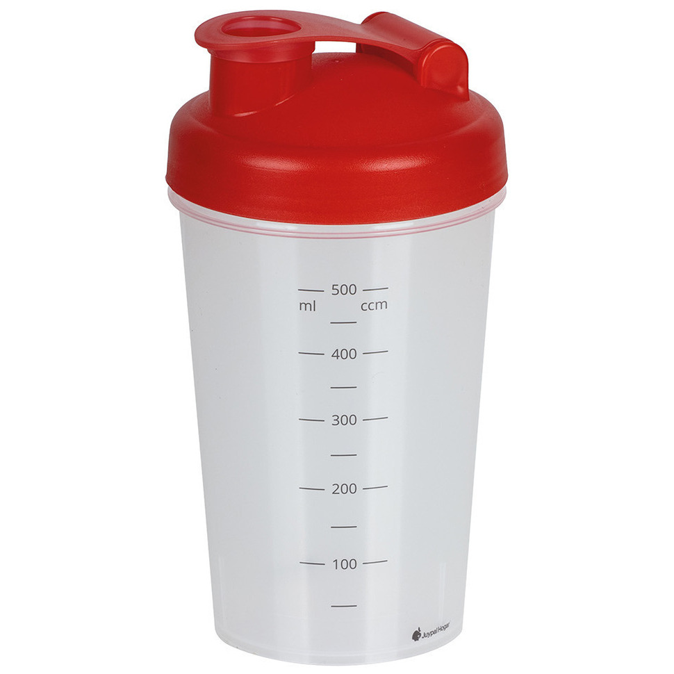 Shakebeker/Shaker/Bidon met handige druksluiting/dop in de kleur rood. Deze beker heeft een afmeting van circa D9,5 x H18 cm en een inhoud van circa 600 ml. Gemaakt van kunststof (polypropylene, 100% BPA-vrij), geschikt voor in de magnetron en vaatwasser (tot 100 graden Celsius).handige multifunctionele drinkfles voor shakes, sapjes en/of water. Voor recreatie en/of sport.