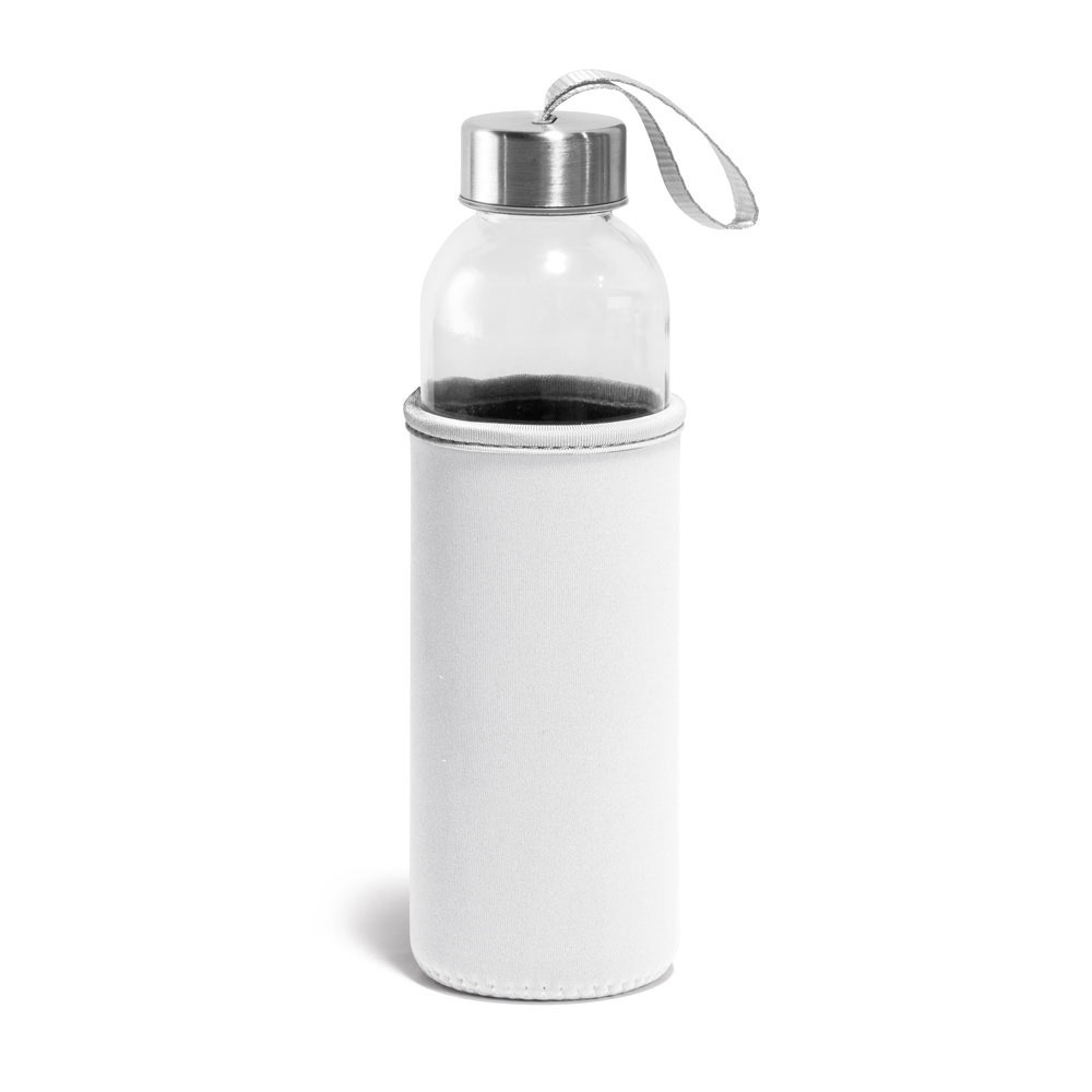 Glazen waterfles/drinkfles met softshell hoes in de kleur wit en RVS schroefdop met handvat. Afmeting: ca. D6,5 x H22,5 cm. Inhoud: ca. 520 ml, 52 cl. Materiaal: verhard glas. BPA-vrij: ja. Geschikt voor magnetron: ja. Geschikt voor vaatwasser: ja, de dop niet. Geschikt voor vriezer: ja. De hoes is wasmachine geschikt.
