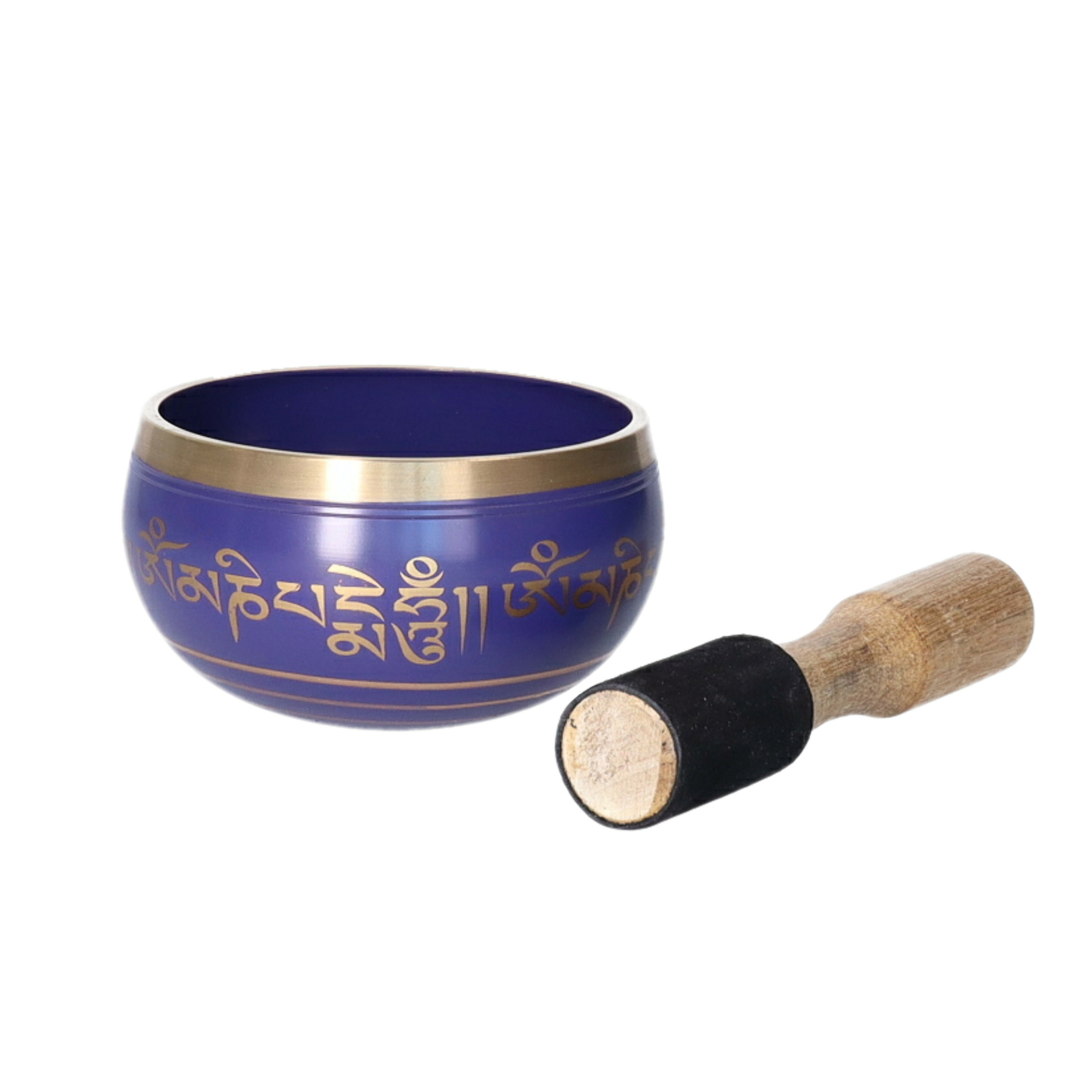 Tibetaanse klankschaal met oosterse print – paars – met aanstrijkhout – messing – D12 x H7 cm