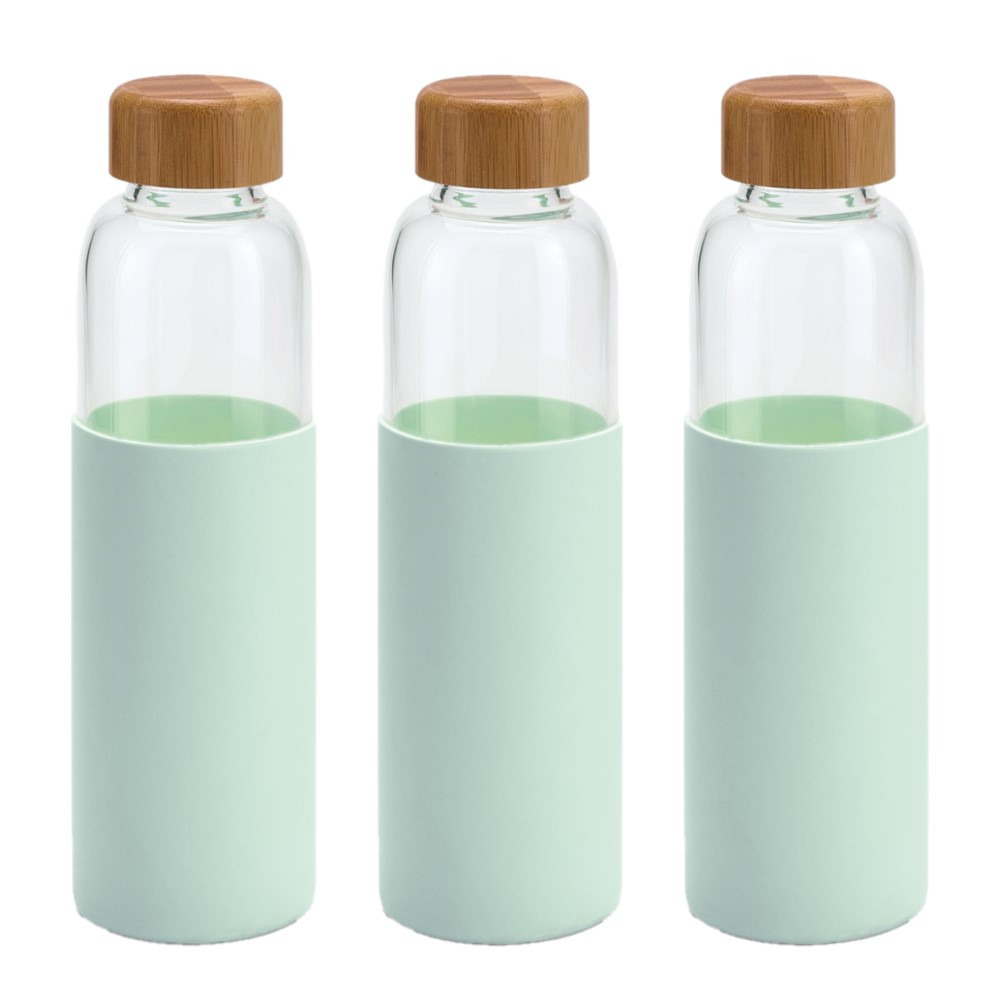 *3x Stuks Glazen waterfles met mintgroene siliconen hoes en bamboe dop ? 600 ml*